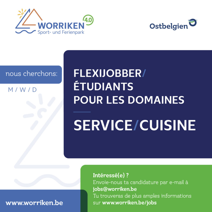 Le Sport- und Ferienpark Worriken va connaître d’importants changements et évolutions au cours des prochaines années. Nous sommes toujours ravis de recevoir des candidatures spontanées motivées pour les différents domaines. Nous recherchons également tout au long de l’année des étudiants et/ou des flexi-jobbers pour la restauration.