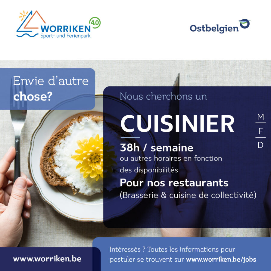Worriken recherche un cuisinier / une cuisinière (h/f/d) à temps plein (38 heures/semaine) ou avec d’autres horaires – selon disponibilité – pour nos restaurants (restaurant à la carte et restaurant de groupe) au parc sportif et de vacances Worriken.