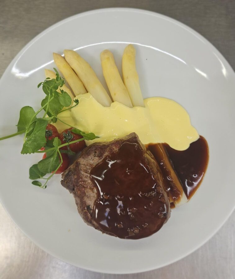 Regionales Entrecôte mit Spargel, Sauce Mousseline und Bordelaise