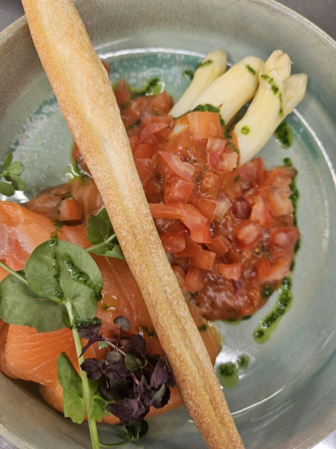 Lauwarmer Spargel mit Räucherlachs, Tomatenvinaigrette und Grissin