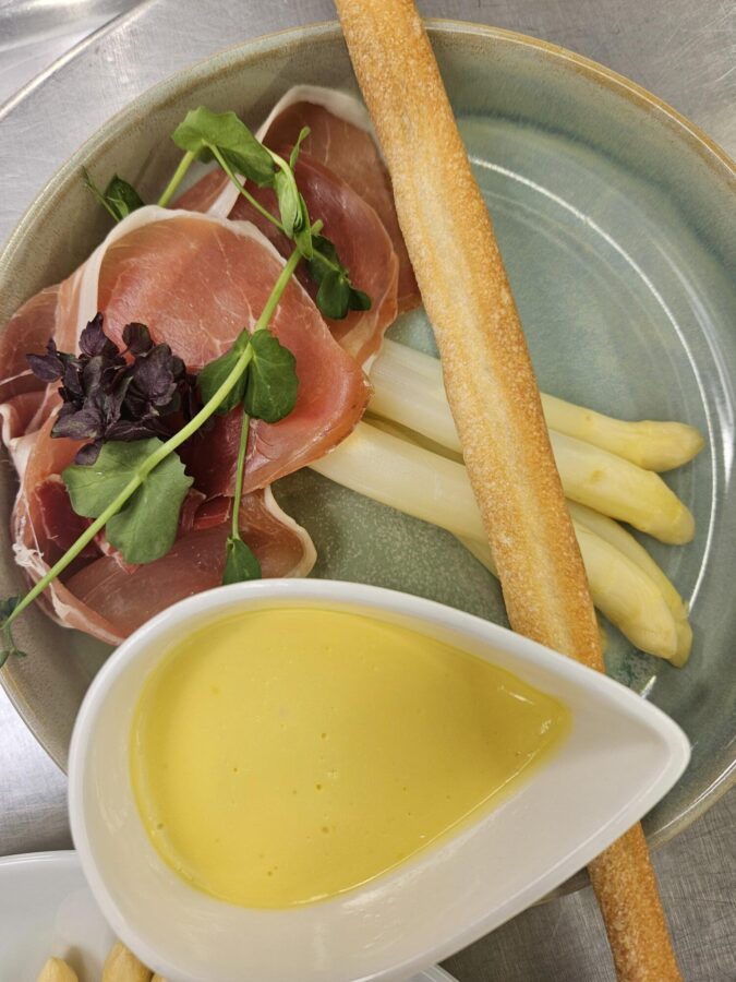 Lauwarmer Spargel mit Serrano-Schinken, Sauce Mousseline